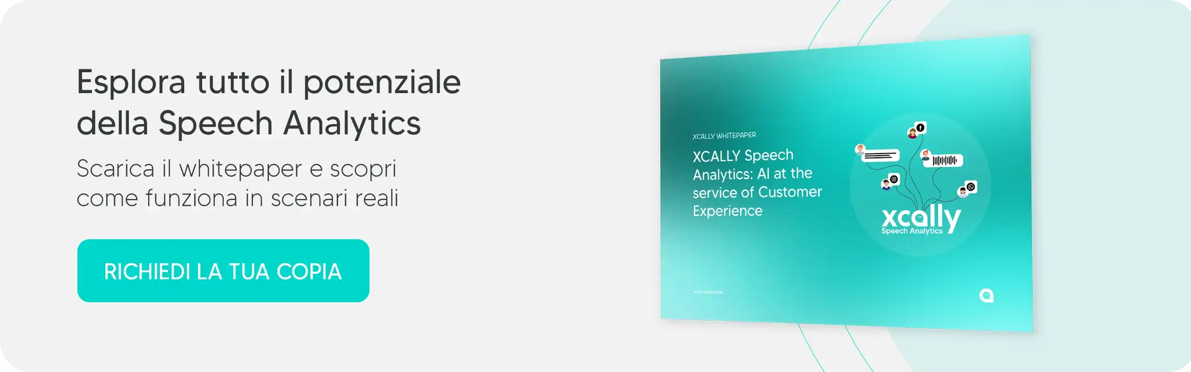 Scarica il nostro whitepaper dedicato a XCALLY Speech Analytics e scoprite come l’analisi delle interazioni alimentata dall’intelligenza artificiale può aiutare la vostra organizzazione a passare dall’ascolto manuale a conversazioni con i clienti realmente guidate dai dati.